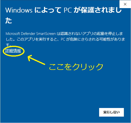 「WindowsによってPCが保護されました」と表示される場合は「詳細情報」をクリックして実行して下さい。