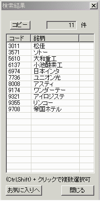 この画面で「お気に入りへ」ボタンをクリックすることで、お気に入りリストに 追加されます。 「コピー」ボタンをクリックすると、クリップボードに検索結果が保存されます。 EXCEL上などで、「CTRL」+「V」を押すことで、「貼り付け」 できます。